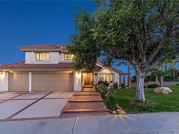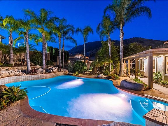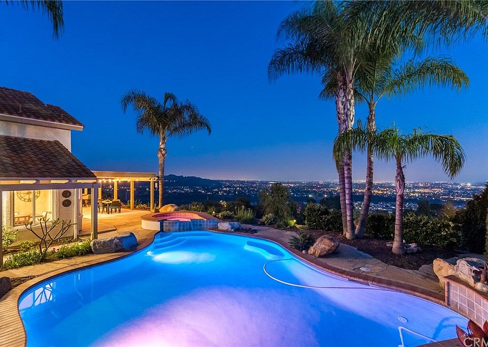 COMPLETELY REMODELED POOL HOME W/PANORAMIC CITY LIGHTS VIEW. Situated on a sprawling lot w/a parklike setting, concrete driveway w/brick ribbon & a brick walkway leading to a covered front porch & new front entry door w/glass sidelight opening to an entryway & living/dining rooms w/hardwood floors. Living room offers picture window w/plantation shutters, vaulted ceilings & french door w/sidelights to backyard. Formal dining room w/views & designer chandelier. Family rm w/hardwood floors, custom fireplace w/tiled surround, wood mantel, views & open to the kitchen. Kitchen features classic white cabinetry, quartz countertops, tiled backsplash, farm sink, stainless steel appliances, vent hood, island w/wine fridge & a peninsula w/bar top seating. Remodeled half bathroom & laundry room downstairs. Upstairs master w/hardwood floors, vaulted ceilings & french doors to balcony w/breathtaking views. Master bath w/carerra marble floors, custom roll in shower w/view window, floating vanity w/dual sinks, marble counters, pendant lighting & two walk-in closets w/organizers. Three additional bedrooms w/wood floors, ceiling fans & plantation shutters plus a hall bath w/tiled floors, quartz countertop & custom tiled shower w/frameless glass surround. Backyard features stunning panoramic views, a pool & spa, planters, mature queen palm trees, covered patio w/new concrete decking, side yard w/potential RV parking, retaining wall & a gentle hillside to behind enclosed w/wrought iron fencing.