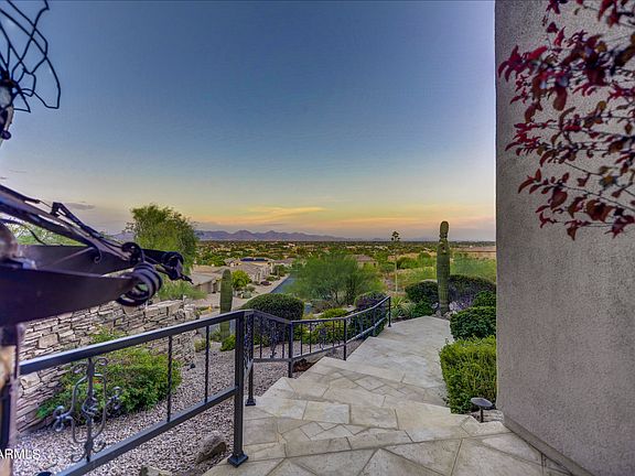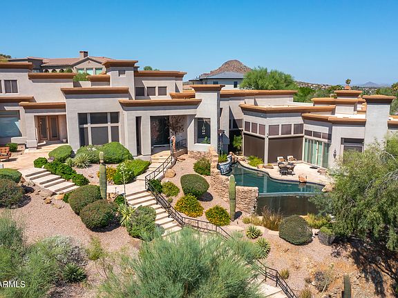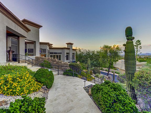 This exquisite custom home is nestled into Shadow Mountain and has been meticulously designed to encompass the most incredible panoramic views of the entire valley and McDowell mountains. Your guests are welcomed into the home through double custom-made glass doors that lead into a large welcoming foyer with soaring vaulted ceilings. The floor plan offers privacy for your guests with separate bedroom suites. Offering 4 large bedrooms on the main floor and one on the lower level as well as a gymnasium. The master retreat enjoys its own living room, cozy fireplace, full kitchenette, upstairs loft, and a separate exit to a private front courtyard to enjoy the city views. The master bathroom creates a spa experience with a soaking tub, large shower, and to top it off huge custom closet Your gourmet kitchen offers two islands, an induction cooktop, two dishwashers, double ovens, warming draws, and a huge pantry. The main level features a gorgeous formal living and formal dining room set high on the mountain with incredible city light and mountain views. Work will be a pleasure in your large custom executive office with custom built-ins.