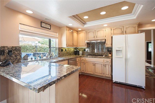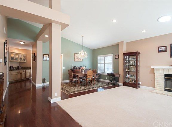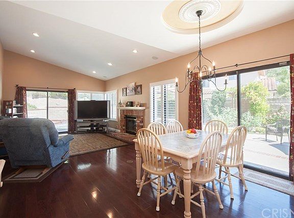 This rare and beautiful single story residence in the Brock Collection features 4 bedrooms and 2 full bathrooms. This home is situated at the end of a cul-de-sac and offers an open floor plan. The high vaulted ceilings and wood floors further enhance this home. Granite counters and stainless appliances highlight the upgraded kitchen which opens to a breakfast area and large family room with remodeled slate fireplaces. Master bathroom remodeled, French doors, wireless sound system, security system, hardwood foors. The private backyard is great for entertaining as it features a pool, spa, grassy area and built in bbq. With award winning, blue ?ribbon schools, this home is a wonderful find!!