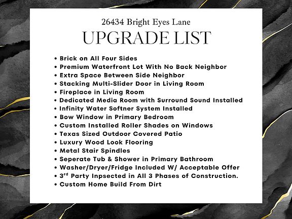 Waterfront Retreat in Jubilee – This custom all-brick home offers unmatched privacy with no side or back neighbors, along with peaceful water views from a spacious covered patio. Inside, soaring ceilings and abundant natural light highlight the seamless open-concept design. The living room features a cozy fireplace and sliding glass doors framing the tranquil view—ideal for entertaining or quiet evenings. The primary suite impresses with elegant bow windows, a spa-like bath with soaking tub, separate shower, and dual vanities. Upstairs, a versatile game room overlooks the main living area, complemented by a media room with surround sound and two generously sized bedrooms. Combining comfort, style, and natural beauty, this home is ready for its next chapter. Schedule your private showing today!