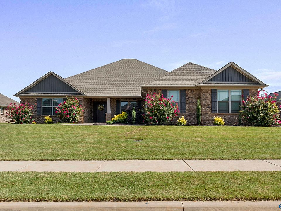 Like-new home in Highland Ridge! Built in 2022, this immaculate 4-bed, 3-bath home offers nearly 3,000 sq ft of carpet-free, single-level living. Enjoy an open floor plan with 10' ceilings, crown molding, and wood-style floors throughout. The gourmet kitchen features granite countertops, a large island, stainless steel appliances, gas cooktop, a walk-in pantry. The spacious family room and formal dining area make entertaining easy. Relax in the private primary suite with a luxury bath, soaking tub, tiled shower, and huge walk-in closet, two more bedrooms and a sunroom offer flexible living space. Outside, enjoy a covered patio, 3car garage, and landscaped yard.