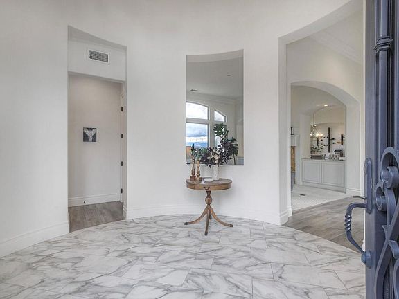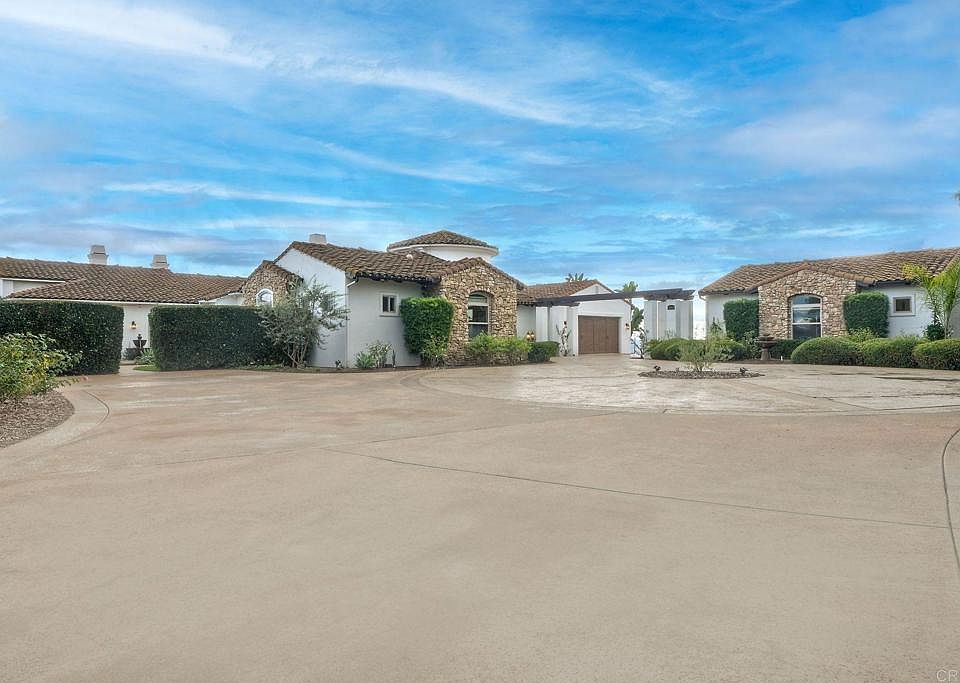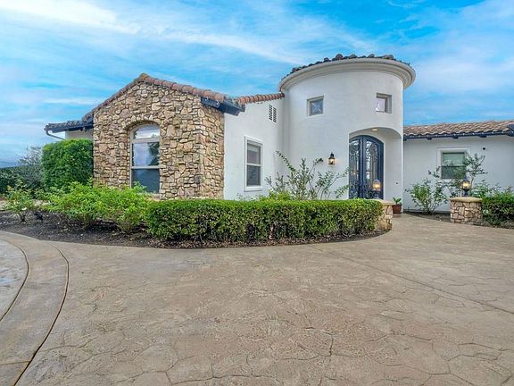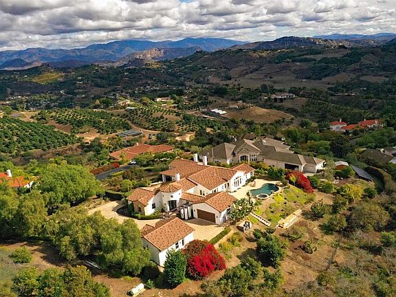 Nestled inside the exclusive gated Champagne Crest community, this single-story estate with a detached casita offers 180° panoramic views stretching to the northeast and southwest—capturing rolling hills, vineyards, and stunning sunsets. This exquisite updated 4BR/5.5 Bath home is perched on 1.58 acres featuring multiple resort-style outdoor living areas, beach entry pool, three waterfalls, hot tub, fire pit, built-in BBQ, courtyard and a covered veranda ideal for entertaining. The modern Spanish Mediterranean inspired design offers all bedrooms with ensuite bathrooms, high ceilings, arched entry's, expansive windows and a spacious chef’s kitchen that opens to the family room. The primary suite includes direct patio and pool access, a spa-style bath and sweeping southwest and sunset views. The detached casita with a full bath is ideal for use as a work space, gym or flex space for all your hobbies. The property is an entertainers delight and a horticulturists dream with over 26 species of tree's (non certified organically treated). A rare opportunity to enjoy privacy, elegance and panoramic Fallbrook scenery in a premier gated community.