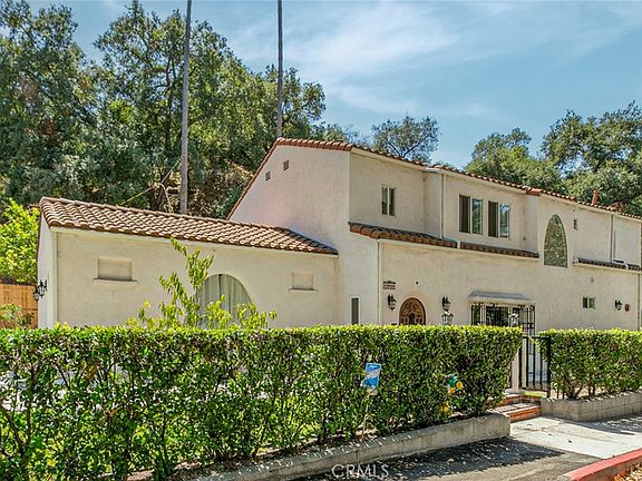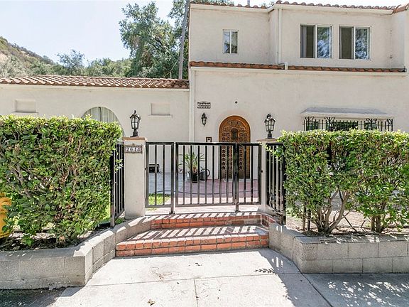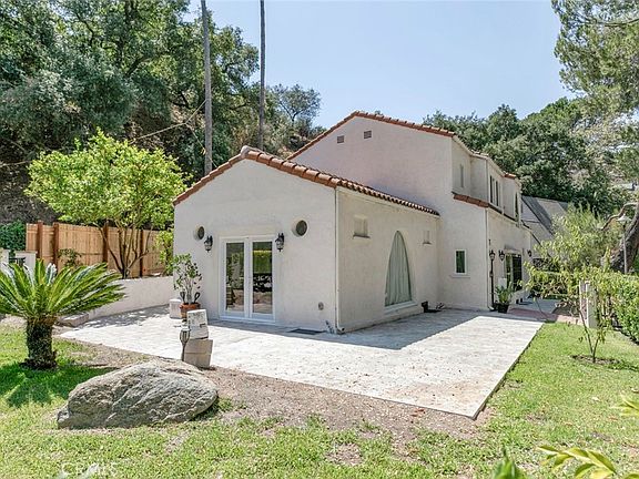 Set in the coveted Chevy Chase Canyon, this Spanish-style residence blends timeless character with sophisticated updates. The striking front door opens to an original tiled foyer, leading into a dramatic living room with vaulted ceilings, fireplace, and French doors to a private patio. Original wood floors and paneled walls in the formal dining room preserve the home’s 1930s charm, while the kitchen offers classic tile counters, a central wood island, and breakfast nook with new French doors opening to a patio retreat.