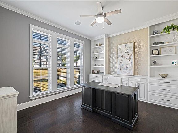 Sophisticated studyCovered front porchCustom millworkPond viewGourmet kitchenCoffered ceilingsTray ceilings