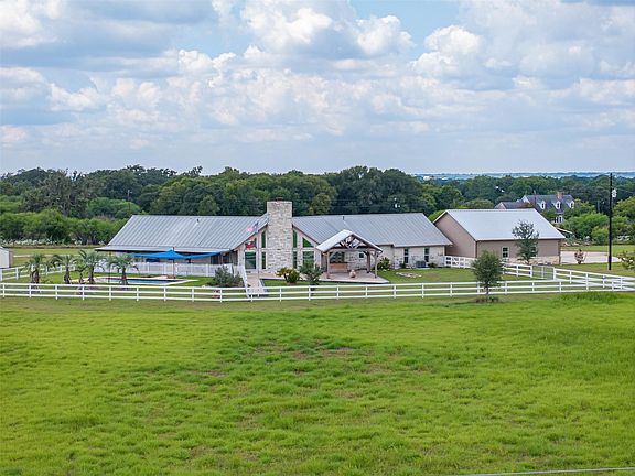 Enjoy outdoor living with a beach-entry pool, covered patio, and gazebo. Additional amenities include a 4-car garage, gated concrete drive, standing seam metal roof, private water well, storage building, and carport. The property is perimeter fenced with improved hay pastures and scattered trees.
