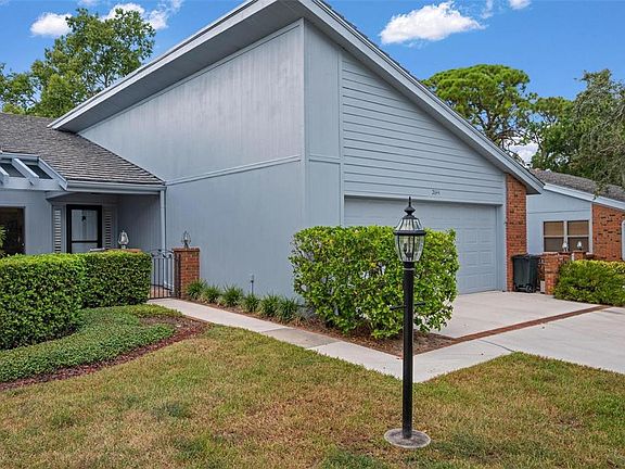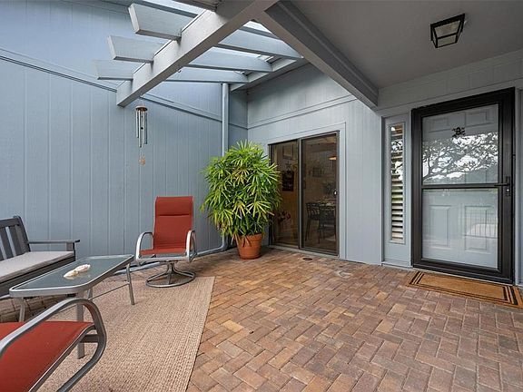 Welcome to the hidden gem of Woodbridge Estates, centrally located, close to shopping, downtown and beaches. This beautiful villa/condo is an end unit, maintenance free, including the exterior and roof, yet feels like a single-family home. Vaulted ceilings throughout the main living area and primary bedroom. A large, screened lanai looks out over a serene private greenery and is accessed from the main living area as well as the primary bedroom. A second private screened lanai shared with the second bedroom and office/den or third bedroom. Kitchen is bright, open and has an eat-in area, pantry and cabinets with lots of workspace, overlooking the front courtyard. The inside laundry room has storage and hanging area. The oversized two-car garage with storage, workspace and outside entry. Woodbridge Estates has 60 units on 13 acres, with heated pool, manor/club house, tennis and pickleball courts.