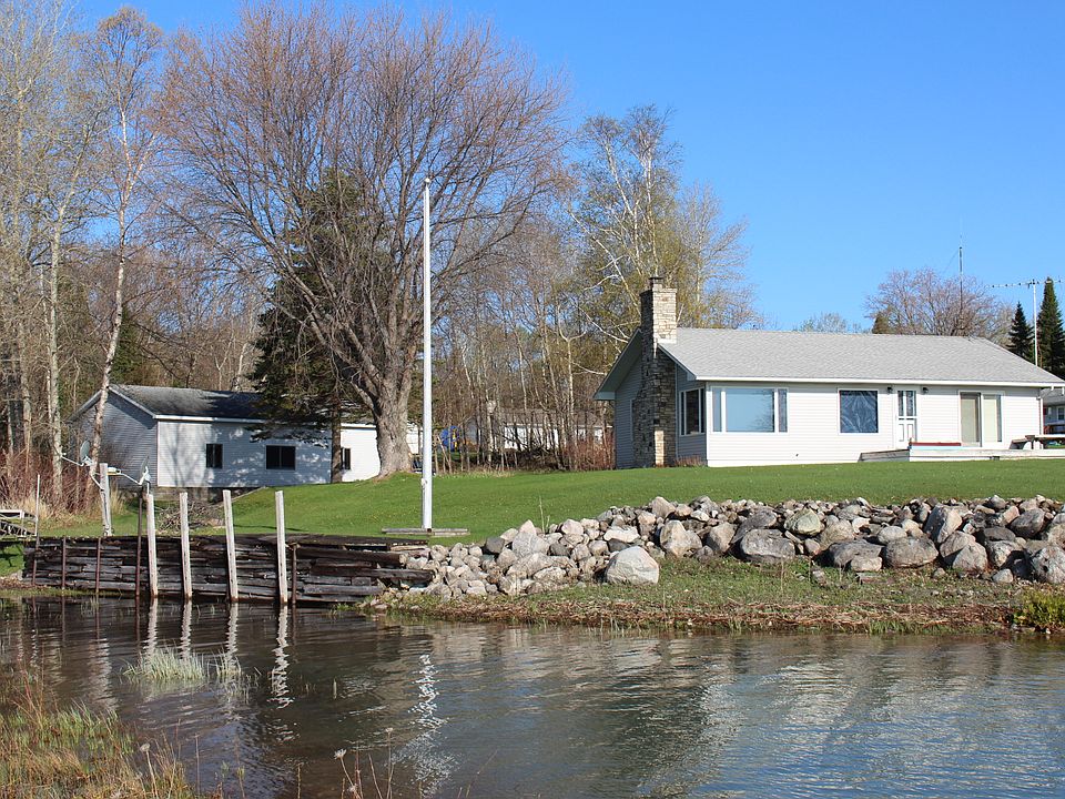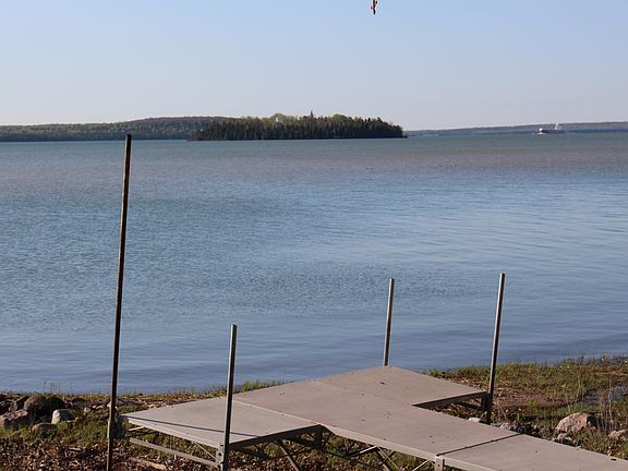 Pt. Aux Frenes home on 297 feet of the St. Mary's river with absolutely unparalleled views of freighters up and down bound, Canada, Lime and Round islands. Property wraps around a small point around which is Raber Bay. Well maintained home, large shop, additional shop along with a two car garage at the house. Boat harbor with breakwall, established lawns and gardens, two driveways and wonderful privacy. Fishing opportunities abound with deep water channel options as well as protected waters in the bays and islands