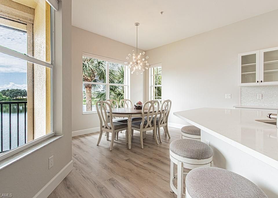 PRICED TO SELL! REMODELED AND READY TO MOVE INTO! Step inside to discover stunning new luxury vinyl plank (LVP) flooring that invites you into a space designed for modern living. The living room, with its custom shelves, exudes character and warmth, while the new fans and light fixtures throughout create an atmosphere of efficiency and elegance. With a brand-new A/C, hot water heater, and ceiling fans, you can enjoy peace of mind and comfort. Experience the security of hurricane shutters, including electric Kevlar on the lanai and accordion-style on other windows, installed around 2022. The kitchen is a true gem, featuring beautiful new cabinets, quartz countertops, and all-new Samsung appliances. Stunning lake views! Each bathroom has been transformed with new vanities, shower floor tiles, mirrors, and toilets, all added in 2021. Pull-down stairs leading to the attic, and a spacious two-car garage complement this incredible property. Bonita Springs is home to wonderful local restaurants, shopping, RSW airport, great activities and more.