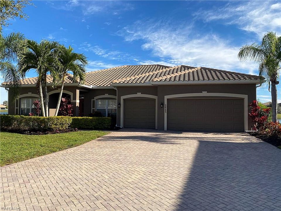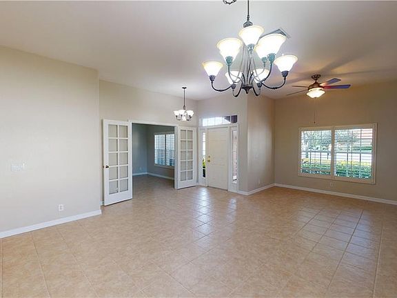 Gorgeous cul-de-sac home with 180 degree water view! This original owner, 4 bed/3bath home has been freshly painted and has tiled floors throughout. 2 of the guest bedrooms feature walk-in closets and a shared bath - the third has classic french doors and would be ideal for an office or workout space. The master bedroom is spacious with plenty of room for a king bed and large furniture. The master bath boasts dual sinks, a jetted tub, updated shower and walk-in closet. With two large living areas, you'll have plenty of room to entertain family and friends - the oversized driveway and 3-car garage ensure they all have a place to park! This home has been meticulously maintained and is ready for a new family! Valencia Lakes is a gated community with very low HOA fees and plenty of community amenities!