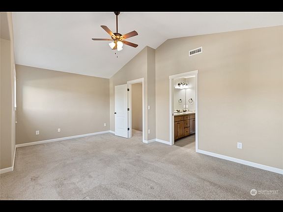 Vaulted primary bedroomStainless steel appliancesGranite counters