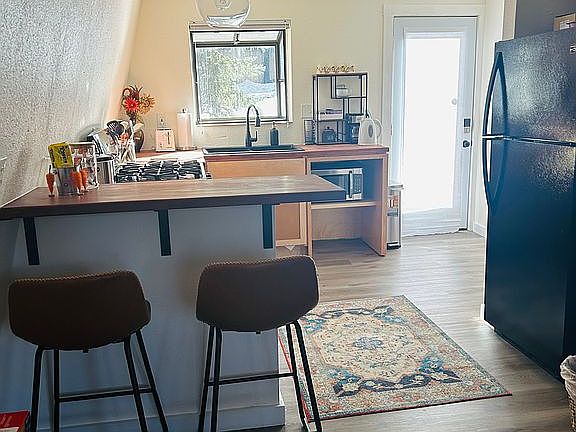 The kitchen includes butcher-block countertops, a breakfast bar, and plenty of cabinet space. Step out onto the spacious deck for outdoor dining, entertaining, or simply soaking up the crisp mountain air. The upstairs bedroom opens to a private balcony, perfect for morning coffee or stargazing at night.