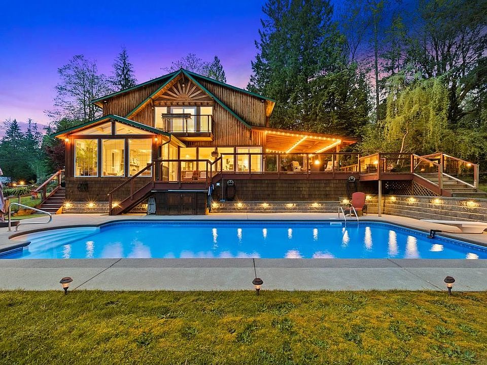 Vaulted ceilingsLarge windowsGas fireplaceHigh-end flooringWrap-around covered deckBeautifully landscaped groundsIn-ground pool