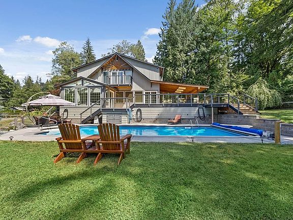 Exquisite fully furnished Whonnock home offering elegance, privacy, and comfort in a peaceful countryside setting just bring your clothes and move right in. This immaculate 3-bedroom (one on the main), 2.5-bath home features vaulted ceilings, a sunken living room with large windows and gas fireplace, high-end flooring, and a wrap-around covered deck overlooking beautifully landscaped grounds. Enjoy an in-ground pool for summer relaxation, a double garage with ample visitor parking, and an electric entry gate for privacy and security. Fully furnished with linens, dishes, kitchen essentials, private laundry, and storage. All utilities, Wi-Fi, and garbage pickup included. Separate one-bedroom suite on property. Flexible lease; no pets or smoking permitted.