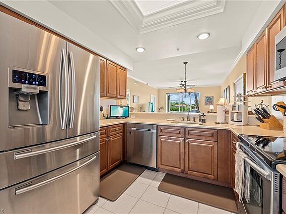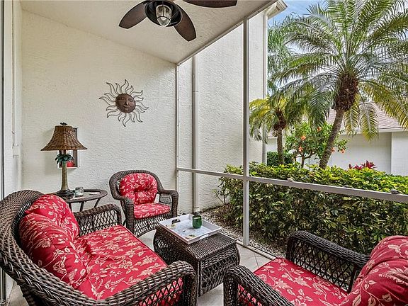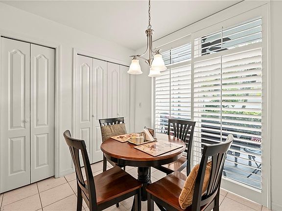 Discover your perfect winter retreat in this exquisite turnkey two-bedroom, two-bath Carlton Veranda, located in the prestigious gated community of Highland Woods. Known for its bundled golf amenities, this impeccably maintained home boasts a desirable split bedroom design and stylish modern updates. The kitchen and bathrooms are adorned with raised panel cabinetry and luxurious Silestone and granite countertops, infusing everyday life with elegance. Natural light bathes the spacious living and dining areas, creating an inviting atmosphere for gatherings. The master bedroom serves as a serene escape, featuring a bay window with breathtaking views & two walk-in closets. Throughout the main living spaces, you'll find tile flooring enhanced by plantation shutters, Hunter Douglas motorized shades, crown moldings, & custom recessed bar. Separate laundry room, storage closet, a one car detached garage with pull downs stairs adds to the everyday comforts of this property. Relax on the rear lanai, where you can take in stunning golf course, lake and sunset views. Situated in the heart of Bonita Springs, this lively community offers the convenience of nearby shopping, dining, and entertainment, with the pristine Gulf of Mexico just 4 miles away. Highland Woods provides a wealth of amenities, including an 18-hole golf course, bocce and tennis courts, multiple community pools, and a cutting-edge fitness center. The newly completed resort-style pool and spa, along with a cabana bar, restaurant, and pickleball courts, further elevate the community's charm. Seize this remarkable opportunity! Envision spending your days on the golf course and your evenings watching the sunset—the ideal setting for a tranquil winter getaway.