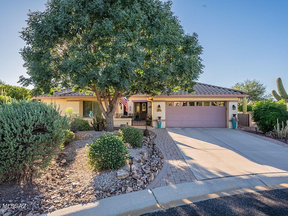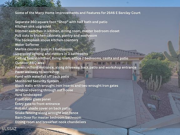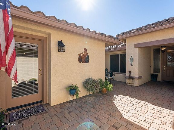 This stunning home in the sought-after Quail Creek community truly has it all! A charming brick paver courtyard welcomes you through a decorative wrought iron gate, where you'll discover a full guest casita and a cozy seating area--perfect for enjoying your morning coffee in peace.Step inside to an open-concept floor plan with soaring ceilings and tasteful updates throughout. The beautifully appointed kitchen features solid surface countertops, custom pull-out drawers, a stylish tile backsplash, breakfast bar, and sunny breakfast nook--ideal for both everyday living and entertaining.The spacious primary suite offers wood-look ceramic tile flooring, a beautifully updated bathroom, a large walk-in closet, and a handsome barnwood-style sliding door for added privacy. A versatile den opens to the main living area, creating a bright and airy space for relaxation or work.