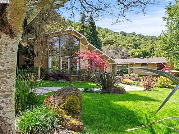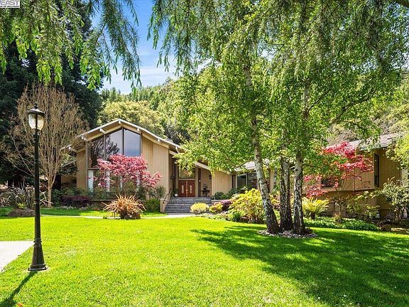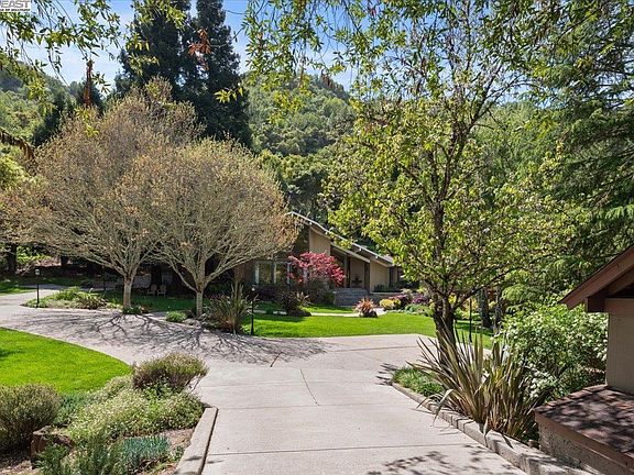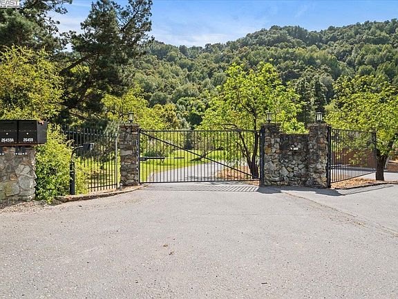 Serenity abounds in this picturesque canyon property on historic Palomares Creek, Castro Valley. With acreage and stunning natural surroundings, this is the perfect setting for your forever home. A spectacular architectural masterpiece awaits you amidst tranquility and the beauty of nature. 5.5 acres total land area including an approximate 30,000+ Sq ft front lot in Walnut trees, ready for your development, such as potential residential structure, ADU, vineyard, tennis courts, etc. Electronically gated, quaint bridge over the creek delivers you, your family and guests to the park-like setting for the residence. Exceptionally well built 4,069 Sq ft custom dream home with breath taking entry, formal dining, formal high beamed living room, high beamed family room and a secondary family room easily converted to a 4th bedroom as originally designed. Modern kitchen adjoining family room with gorgeous views of pebble-tec pool, rear large enclosed garden and magnificent natural heavily treed canyon hills. Private primary suite with high beamed ceiling, front garden views, large bathroom, walk-in closets and exercise area. One mile to the 580 Freeway provides easy access to the outside world!