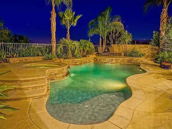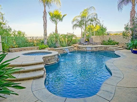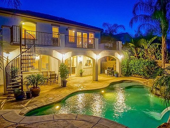 Beautiful Spanish style pool home with magnificent views of the valley located on a cul-de-sac featuring designer touches throughout. This home boasts Wolfe appliances, marble countertops and fully remodeled kitchen, plantation shutters, raised based boards, crown molding, fireplace, 18" tiles, upgraded wood floors, downstairs bedroom and full bath. Large master bedroom has en suite bathroom w/ two walk in closets and private balcony that aligns w/ the back of the house. Over $180,000 spent on the backyard featuring wood beamed covered patio w/ ceiling fans and spiral staircase going upstairs and high tech salt water pool w/ solar heating, water features, and connecting spa all to enjoy while looking out amongst the amazing view!