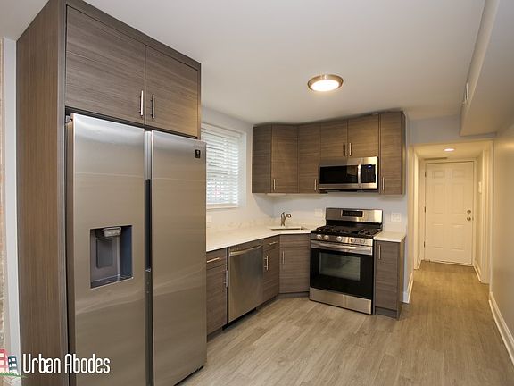 Awesome Logan Square gut rehabbed one bedroom plus den/office, one bath features central air, updated kitchen with all stainless kitchen, quartz countertops, gas oven/range, fridge, dishwasher, microwave, large living/dining room, hardwood floors throughout, ceramic tile bathroom, private deck, free laundry attached to unit, beautifully landscaped back yard, fully enclosed with fence, easy street parking, pets OK! Short walk to the Boulevard and the Blue Line! Walk to Logan Square cafes, shops and nightlife!
