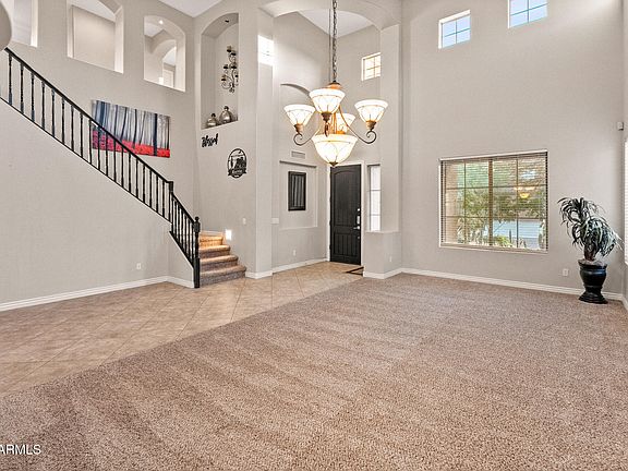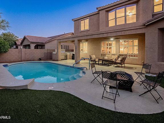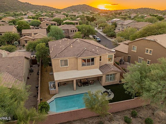 Exceptional opportunity to own this WestWing Mountain home! 5 bedrooms, 3 baths which includes a full bed/bath downstairs that's perfect for guests. Step inside to a beautiful living/dining room with vaulted ceilings and a stunning staircase. Gorgeous kitchen with quartzsite countertops, beautiful cabinetry, large island with seating, stainless appliances and a perfect spot for a breakfast table. Cozy family room anchored with a stone fireplace. Generous sized primary bedroom with ensuite bath featuring dual vanities, large soaking tub, step in shower and walk in closet. Additional flex space is perfect! Great outdoor living space with covered patio overlooking the sparkling pool, outdoor kitchen space and synthetic turf! This home has everything you are looking for!