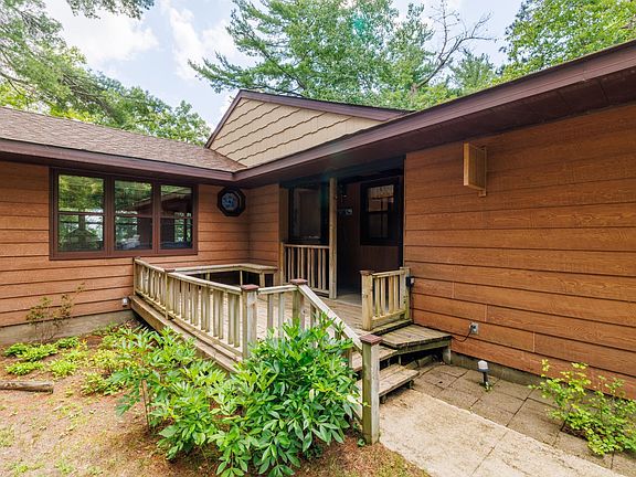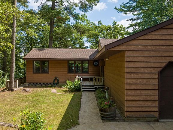 This charming year-round home has so much to offer, from the knotty pine interior, eat in kitchen, living room and 2 bedrooms with a full bath on the main level. The lower-level walkout is comprised of a spacious family room, laundry, utility room, den and study. Ample storage and built-ins, including an attached heated double garage with a paved road all the way to the house, 3 season porch that walks out to a huge 2-tiered deck with amazing lake views. Set in amongst the towering pines with gentle elevation down to the dock, firepit and boathouse. Upper Bottle is an amazing lake prized for its fishing, boating and wildlife.
