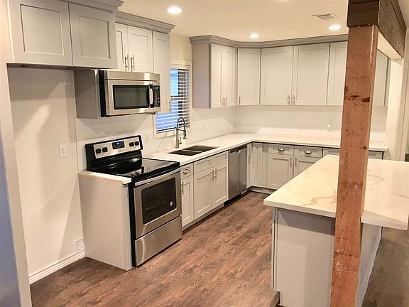 ADORABLE all newly renovated starter home on a curbed & guttered street. Gorgeous open plan with all new wide plank laminate floors & paint throughout. Large living with a big picture window & dining area with a cedar ceiling stained beam. Beautiful kitchen with new cabinets,granite,fixtures, and stainless range & dishwasher. An extra 7.8 x 7.3 Mud room/butler's pantry and 7.3 x 6.4 laundry room. Spacious bedrooms with all new ceiling fans,doors,door knobs and fixtures. All new large bathroom w/new sink,cabinet,granite,fixtures & tile tub surround. Huge deck off of breakfast area through the new sliding doors, nice size privacy fenced backyard, 10 x 12 storage building with a FULL bath! Exterior is freshly painted with new energy efficient windows, fixtures. Windstorm certified 30 year arch roof 4/06 and BIG driveway for plenty of parking. OWN me for just under $1,250. a month!!! PNGISD SELLER SAYS MAKE AN OFFER!!!
