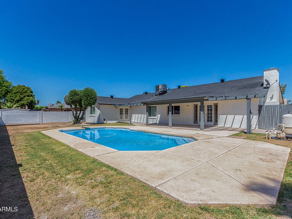 Beautiful 4-bedroom residence in Mesa is finally on the market! This home offers a 2-car garage with attached cabinets and 2 RV gates. Meticulously crafted interior boasts an new carpet and paint, plantation shutters, tile flooring, recessed lighting, and a large living room perfect for receiving guests. Large great room is enhanced with a stone fireplace and French doors leading to the back patio. The kitchen provides built-in appliances, plenty of cabinetry, granite counters, and a convenient breakfast bar. Take a look at the main retreat showcasing plush carpet, direct outdoor access, a walk-in closet, and an ensuite with a jetted tub. Secondary bedrooms have bi-folding closets. Wow! This dreamy backyard includes a covered patio and a sparkling pool ideal for warm summer days.