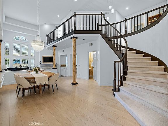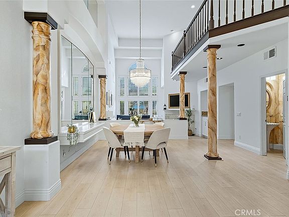 Inside, you’re greeted by dramatic 18-foot ceilings, a grand curved staircase, and expansive windows that fill the home with natural light and create an open, airy ambiance. The formal living room is highlighted by a fireplace and soaring two-story windows, while the adjacent dining room showcases elegant architectural columns and mirrored accents.