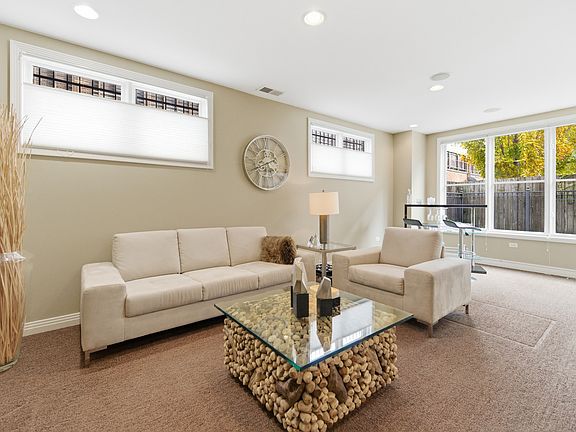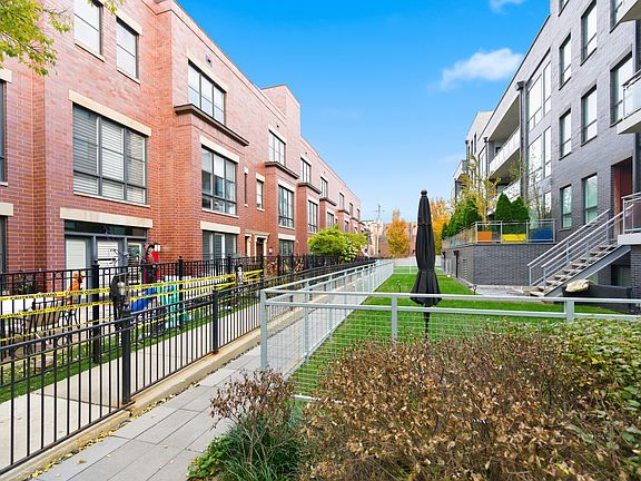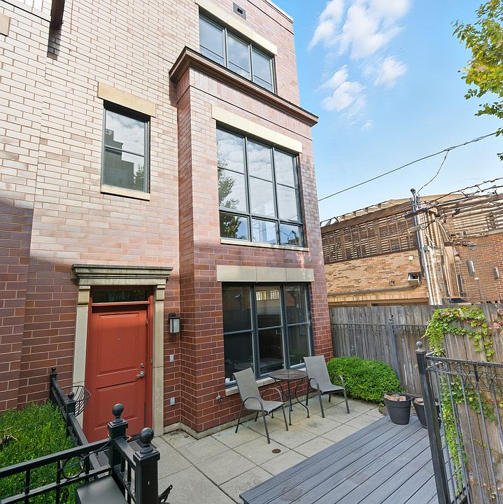 Rarely Available South East Facing 4 bedroom 4 1/2 bath CORNER row home in the exclusive Hartland Park community with tons of light and SKYLINE VIEWS. 3 outdoor spaces. This lovingly maintained home lives like a single family with great entertaining space. Enter thru the lovely south facing patio. The 1st level is complete with a formal entry way, a family room that could be a 5th bedroom and full bath. 2nd floor features the living room with a gas fireplace, dining room and the Kitchen with eat in/tv/play area that leads out to a balcony. 1/2 bath. Kitchen is ample with 42" cabinetry, and has high end appliances, Wolf, Bosh and Sub Zero. 3rd floor has 3 bedrooms with one on suite, a second bath and a laundry closet with side by side w/d. The 4th floor has an ample primary suite that leads out to a wonderful deck with Skyline Views, and exudes 3 closets, and a primary bath with Marble tile, steam shower, soaking tub and dual vanity The open floor plan allows for great entertaining. 2 car attached heated garage. Dual HVAC, replaced in 2023. Professionally managed community offers resident-only playground, park, basketball court and dog run. Fantastic walk-to-everything location steps to Chi Che Wang Park, Wrightwood Park, restaurants, coffee shops, boutiques, groceries and highly rated Prescott School!