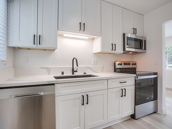 New blindsPlanter boxesNice common areaBrand-new stainless-steel appliancesWhite cabinetsLarge black kitchen sink
