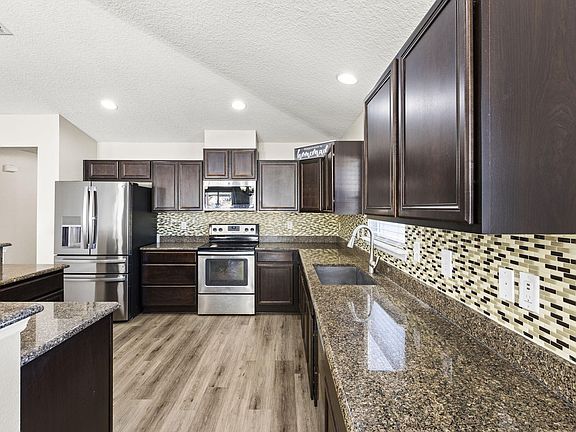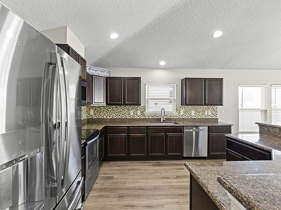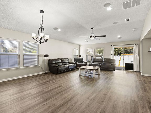 This 3-bedroom, 2-bath home offers stylish comfort with a chef-inspired kitchen featuring stainless steel appliances, granite countertops, and ample cabinet space. The entire house just received an upgrade of LVP flooring throughout! The open living area includes built-in surround sound for an immersive entertainment experience.The spacious primary suite boasts a HUGE walk-in closet, while ceiling fans in every room add comfort. Enjoy outdoor living in the fenced backyard with a covered patio, perfect for relaxing or easily screening in. Equipped with a hardwired security system for added peace of mind and a fully integrated irrigation system to keep the landscaping hassle-free.Conveniently located near shopping and dining, along with schools close by, this home is move-in ready!