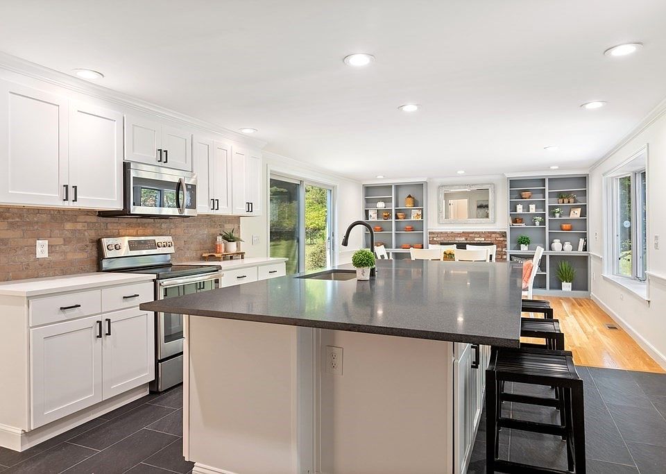 Completely renovated, quintessential, New England colonial nestled on 2 acres in desirable North Framingham. You will love the charm of driving under breezeway each day to your new home. Stunning foyer with new floors that opens into an intimate dining room and sunny home office. New kitchen with white mission style cabinetry, quartz counters along with an oversize 11’ breakfast bar with honed granite, pantry and new floors that opens into a gathering room with wood burning fireplace and built-ins. Huge ~570 sq ft family room with 10 ft ceilings, wood burning fireplace and patio door to bluestone patio. Upstairs, 4 bedrooms and 2 baths with new windows and hardwood floors. Master bedroom features two walk-in closets and private updated bath. Newly finished basement with shiplap walls, wine cellar, workshop and plenty of storage. New roof, windows, paint inside and out, moldings, walkway, and more. Ready to move in and enjoy. The private grounds are stunning w possibility to subdivide.