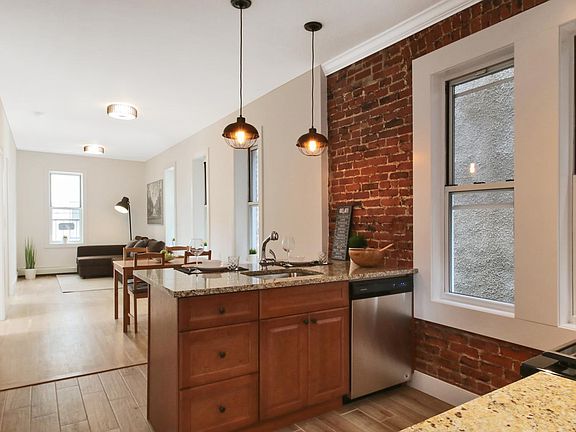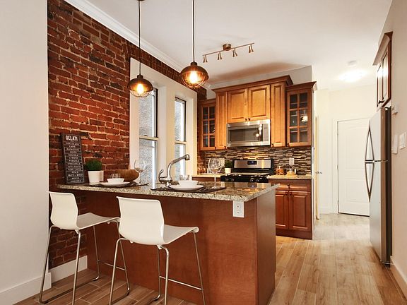 Updated kitchenCharming exposed brick wallsHardwood floorsStylish three-bedroom apartmentStainless steel appliancesMosaic tile backsplashGranite countertops