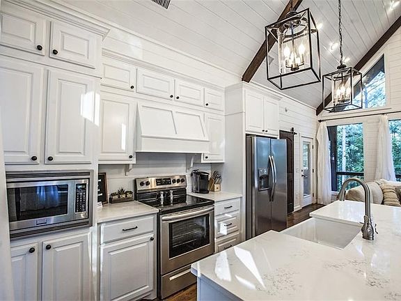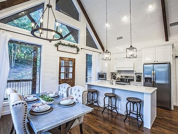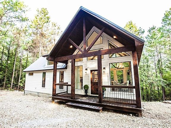 The Caroline is the ultimate luxury retreat, with no detail overlooked. Ten-foot ceilings and oversized windows, feature hillside views and bring the outdoors right into the living areas. The natural wood beams and shiplap are inspired by the modern farmhouse movement and provide a relaxing and romantic atmosphere. The master bedroom features a king size bed, vaulted ceilings, and a walkout to the covered deck. An oversized bed with luxurious textiles. The sleek bathroom offers a private oasis with a large walk in shower featuring dual shower heads and an oversized soaking tub. The spacious outdoor patio is located off the master bedroom with access from the living area as well. At 15 feet above ground level, the patio overlooks the hillside and pine trees. The patio is equipped with a large hot tub, beautiful stone gas fireplace, lounge, dining, and grilling areas. Below the deck is an area for lawn games and a wood burning fire pit perfect for s’mores. Call today!