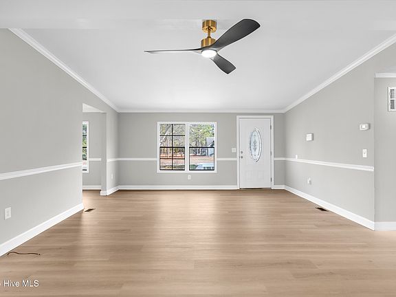 Welcome home to this beautifully updated 3-bedroom, 2-bathroom residence, perfectly designed for comfort and modern living. Step inside to find brand-new LVP flooring and fresh paint throughout. The spacious living room features a stunning fireplace, perfect for cozy evenings. The dining area flows seamlessly into the kitchen, which boasts new stainless-steel refrigerator and dishwasher, ample cabinet space, and new fixtures for a sleek, contemporary feel. Just off the kitchen, a separate laundry room adds extra convenience. The primary suite is a true retreat, accessed through double doors and offering three closets for generous storage. The en-suite bathroom features a double vanity, a large garden tub, and a walk-in shower, providing a spa-like experience. On the opposite side of the home, two additional bedrooms offer comfort and space, along with a full bathroom featuring a walk-in shower. Just off the living room, enjoy the enclosed sunroom, perfect for relaxing year-round. The fully fenced backyard provides privacy and includes a large storage shed for all your outdoor equipment and tools. NO HOA and NO CITY TAXES!!! Ideally located close to schools, shopping, dining, Camp Lejeune, and the beach, this move-in-ready home is a must-see. Schedule your private tour today!
