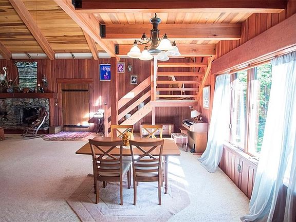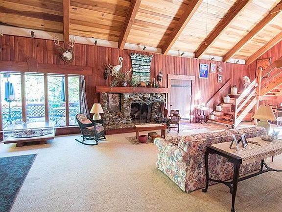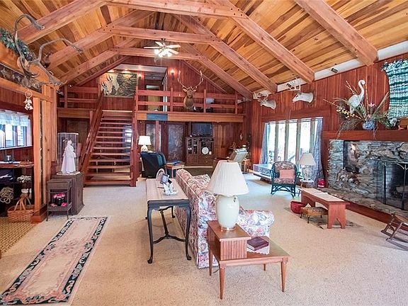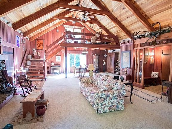 This unique Timber Home is tucked back into 15.47 scenic treed acres providing a tranquil private setting to relax or just enjoy the abundant wildlife. This home was lovingly finished with wood from the property including cheery wild cherry and oak. A stunning vaulted Great Room is complimented with a custom stone fireplace, poplar wood ceiling, plant shelves/Loft, wood floors and is combined with a Dining area. The Kitchen includes an island breakfast bar and nice cabinet space. There is a paneled Den and a Studio Room that could be converted to a 1st floor Laundry. A large deck is accessed off the Great Room. The deluxe Owners Suite features a walkout balcony. Enjoy a finished basement with red oak post and beam walls plus an additional stone fireplace. Extra rooms can be used as Hobby/bonus rooms. A super nice 34x48 pole barn has electric and gas perfect for workshop, wood working. 6" concrete floor, wood burner and unfinished upstairs. There is free gas to the home.