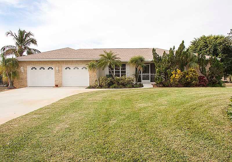 Sailboat water in Cape Haze! This canal front home has over 2500 square feet under air and approximately 130 feet of seawall on Capstan Cut, with no bridges to the Intracoastal Waterway and Gulf of Mexico. The inviting family room has a vaulted ceiling, stone hearth and wood burning fireplace. Sliders from the living room, family room, master bedroom & third bedroom open onto a large lanai which is perfect for enjoying the Florida weather. Features include a large eat-in kitchen, screened entry, walk-in closets in all bedrooms, a workshop area, heated pool and much more. The large lot has landscape curbing and an irrigation system with well for the tropical landscaping. A private dock provides easy access to boating, kayaking, fishing or watching the wildlife.