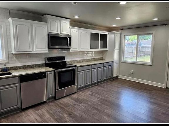 Fenced in large backyardCovered back patioGrey laminate wood flooringUndermount sinkOutdoor kitchenKitchen has granite countertopsRecessed lighting