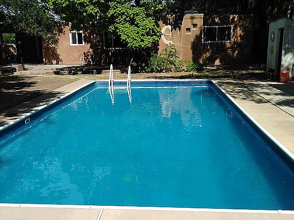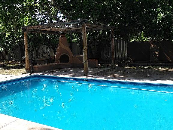 **Open Houses canceled! Don't miss this opportunity to own this unique property in the Valley! The main house features three bedrooms and two bathrooms. Two living areas, plus a game room with a built-in wet bar and kiva fireplace. A pool separates the main house from the guest house/outbuilding. Outdoor wood-burning kiva fireplace and built-in seating! The guest house/outbuilding has two bedrooms and two bathrooms but no kitchen and makes a great pool house! Situated on 0.85 acres! Gated Entrance, Short distance to paths along the Rio Grande River. Closet to ABQ Bio Park, Albuquerque Zoo, and Tingley Beach! Quick access to Central and Old Town! Take a virtual walkthrough tour or schedule a private showing! Home is being sold AS-IS.
