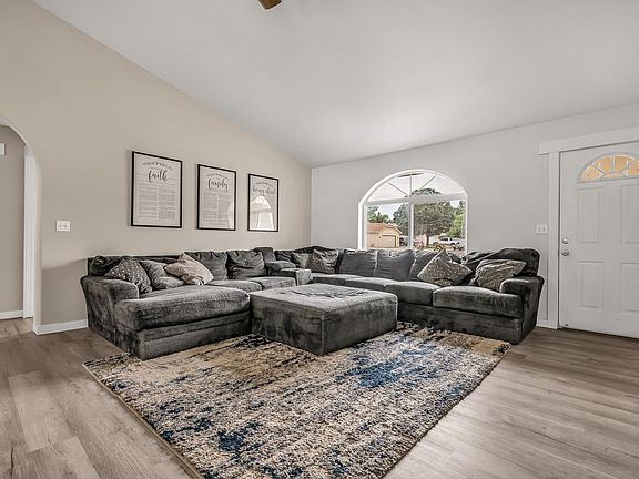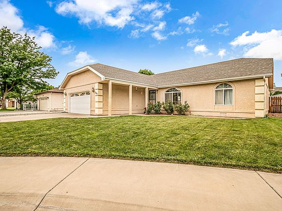 Easy Fruita living is calling! This beautiful home, situated on an immaculately maintained lush green lawn with mature trees and rosebushes offers the quiet & privacy of a cul-de-sac within a short walk or bike ride to the community center & all that downtown Fruita has to offer. Lots of natural light pours in through large windows into vaulted ceilings in the main living area, which flows easily into the dining and kitchen spaces. The kitchen features high end stainless Samsung appliances and a bay window, providing a view out onto the beautiful back yard. The covered patio allows for extra room to grill, entertain or just sit and enjoy the outdoors. The split floor plan provides for a spacious primary suite, complete with a 5 piece bathroom, on one end of the home & 2 more large bedrooms and a full bath on the opposite end. 2 large sheds in the back yard, shelving & cupboard units in the garage & space to add RV parking next to the home provide plenty of options for storage. Bonus: Brand new washer & dryer also stay! Come see this one today! THIS JUST IN!! Sellers are now offering a credit of $10,000 at time of closing towards recommended back patio concrete repairs & landscaping!