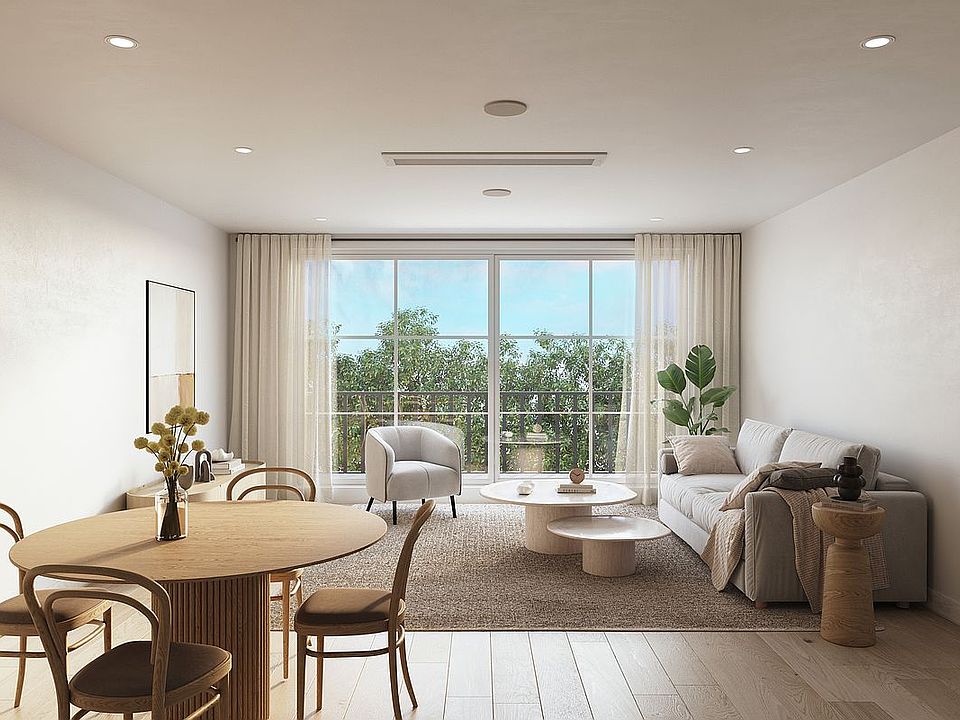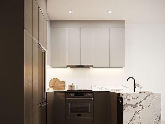 Residence 4B offers 620 square feet of carefully planned interiors complemented by a 70-square-foot private balcony. This penthouse one-bedroom home features an open-plan living and dining space designed for light and flow, anchored by a modern marble kitchen with fully integrated appliances. Oversized windows fill the room with sunlight and provide a natural extension onto the balcony, seamlessly connecting indoors and outdoors.