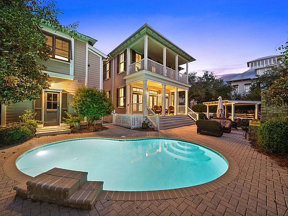 Experience the best of WaterColor from this timeless 5 bedroom, 5.5 bathroom Southern-style retreat, ideally located on the corner of Buttercup Street and Western Lake Drive. Just steps from the WaterColor Beach Club, town center, and the Gulf, this home blends charm, comfort, and convenience in one of 30A's most sought-after settings.A private outdoor oasis features a swimming pool, cabana, outdoor fireplace, and brick-paved courtyards, all tucked behind a natural community buffer that provides both privacy and seclusion. More than 1,200 square feet of wide, wraparound porches invite you to relax while enjoying views of Western Lake and the activity of 30A. Inside, natural light floods the open living and dining areas through transom windows and French doors. Pine hardwood floors, high ceilings, and classic Southern details create a warm and welcoming atmosphere. The kitchen is appointed with granite countertops, stainless steel appliances, a breakfast bar, and ample cabinetry.