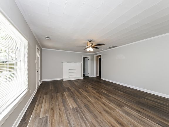 The spacious living room features LVP flooring throughout, a large window that fills the space with natural light, and a brick mantle that adds warmth and character.