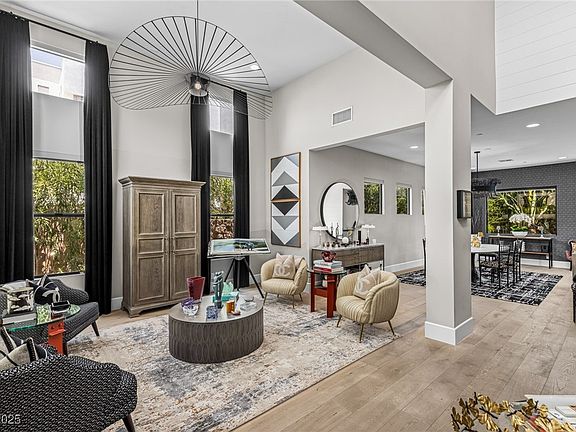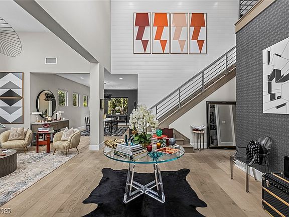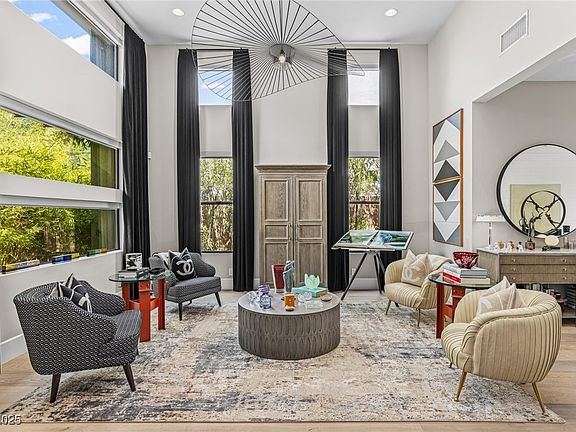 Experience elevated Las Vegas living in this custom estate in a private gated community of just 10 homes. Bold design with soft, luxurious finishes, this modern retreat offers privacy, elegance & comfort. Over $1M in upgrades include hardwood floors, bespoke cabinetry, designer carpet & curated finishes. Expansive glass sliders create seamless indoor-outdoor flow with stunning Strip, city & mountain views. The resort-style backyard features one of the largest pool/spa combos, outdoor kitchen, lush landscaping, putting green/RV pad & climate-controlled 4-car garage with storage. The chef’s kitchen offers Wolf/Sub-Zero appliances, walk-in & butler’s pantries. The primary suite includes a fireplace, sitting area, spa-like bath, custom walk-in closet. A guest suite with private entrance off the courtyard is perfect as a casita. Smart-home tech, blackout shades, walk-in closets in every bedroom & pristine, smoke & pet-free condition, less than 9 years old complete this one-of-a-kind home.