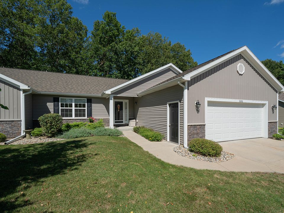 Wonderful ranch condo in Hunters Creek community! This lovely condo offers great space with over 2200 sq ft of living space! If you like to entertain you'll love the open floor plan between kitchen and great room with cathedral ceiling. Beautiful Aristokraft cabinetry along with granite counters, SS appliances, large walk in pantry, & snack bar. Great room is highlighted by the lovely stone gas fireplace and views overlooking the private backyard. Master suite features tray ceiling with crown molding and full bath with double granite vanity, large walk in shower, and walk in closet. Private deck area is accessed by 3rd bd/office and includes awning. The lower level offers great additional living space with 4th bd, full bath, rec rm, and large storage room. Extra wide 2 car att garage.
