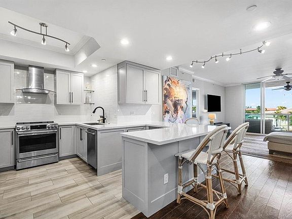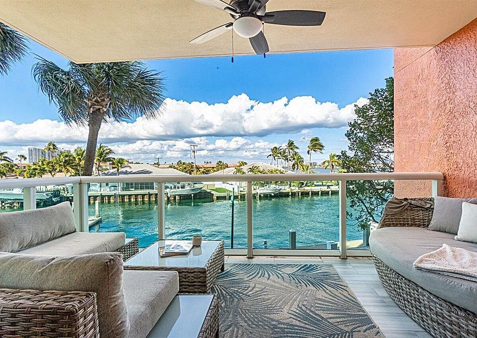 Turnkey waterfront CORNER UNIT w/2BR+dining/den, 2BA. Beautifully remodeled & expanded kitchen, impeccably maintained, neutral colors. Impact glass, semi-private elevator access. Open concept, split floor plan w/spacious owners suite w/his & her walk-in closets. Primary bathroom w large stand alone shower & jetted bath. Light & bright coastal inspired unit has a fabulous renovated kitchen that opens up the space and allows for easy entertaining with family and friends. Assigned garage parking & climate-controlled storage unit. 24/7 manned gate, valet, walking path w/gazebo. Adjacent Marina w/dry docks, minutes to ocean. No cats/allergies