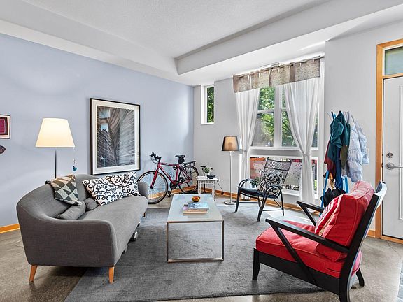 Ideally located between Minneapolis and St. Paul, this one-of-a-kind corner unit offers privacy, space, and style. It features a private street-level entrance (great for biking and pets). Just steps from the Green Line and near shops, parks, and the Mississippi River, and the U of M. Private 12x7 porch, and floor-to-ceiling windows with great natural light. Highlights include 14-foot ceilings, granite countertops, stainless appliances, and a butcher block island. Twice the Sqft on most 1br units in the metro. The oversized bedroom and multiple walk-in closets provide ample storage. Enjoy in-unit laundry (new in 2025) and direct access to a heated garage with two parking stalls—a rare find in this prime Twin Cities location.