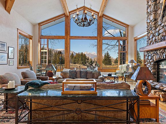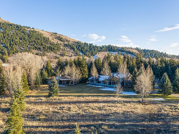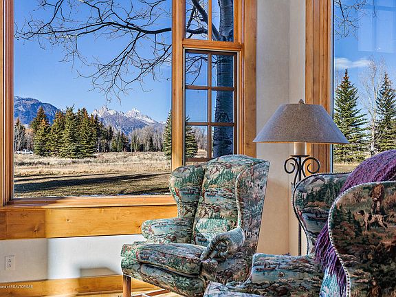 Framing exquisite views of the Teton Range, this 3 bed/3.5 bath home with 1 bed/1.5 bath guest house is ideally-located in the exclusive John Dodge area, less than 4 miles from JHMR and a few minutes' walk from the Snake River. Nestled on nearly 4 acres with native trees, a stream, pond and spacious deck, this abode is an ideal mountain retreat. Ample windows welcome boundless natural light and evoke a sense of immersion in the surrounding nature. The interior boasts a blend of contemporary and rustic ambiance with the warmth of wood finishes, 3 handcrafted river rock fireplaces, and double-height ceilings. The spacious kitchen offers all the refinements. Each bedroom enjoys an en-suite bathroom. The guest house shares stunning views and features a river rock fireplace, deck and garage.