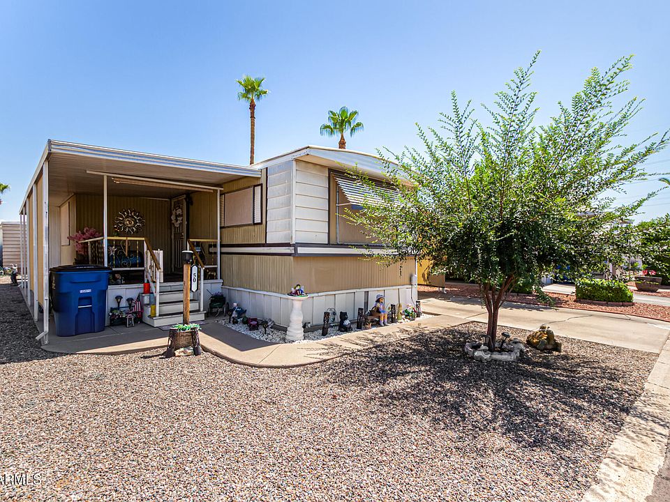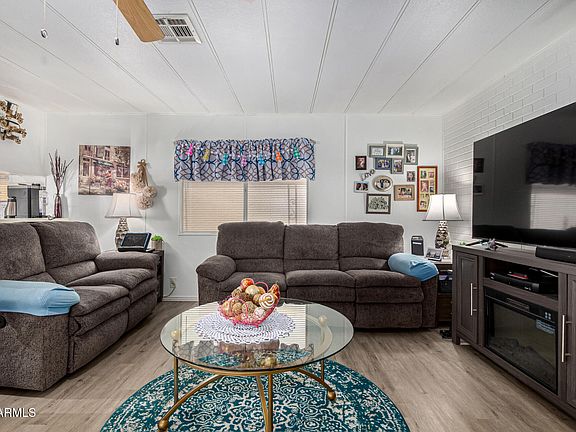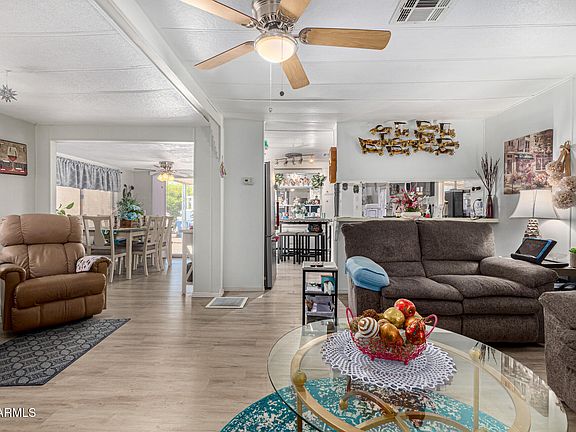 Tucked inside a friendly gated community, this charming 2-bedroom mobile home is ready to impress! A cozy living room sets the stage for entertaining, while wood-look floors add warmth throughout. The kitchen shines with stainless steel appliances, crisp white cabinetry, generous counters, and a breakfast bar perfect for casual bites or morning coffee chats. Retreat to the primary bedroom with its own private bath for sweet dreams. Bonus perks? A storage room for all the extras plus a carport for convenience. Community amenities include a sparkling pool, relaxing spa, fitness center, and more, because a home should feel like a getaway. Welcome to easy living! Financing available!