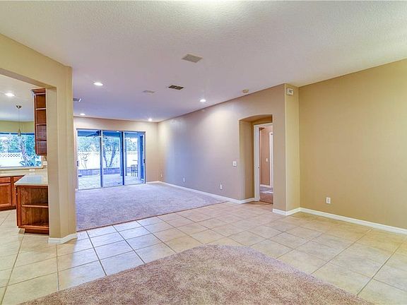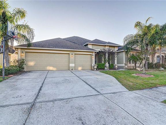 Stunning Move in Ready 2 story 4 bedroom, 3 bathroom home in Wesley Chapel's Seven Oaks Association. Gorgeous lot with mature landscaping. Entry opens to spacious living room/dining room with tile in high traffic areas. Brand new carpet, 2 tone paint and plantation blinds. Downstairs master bedroom with wood laminate flooring, en-suite jack and Jill bathroom plus dual sinks, and walk in closet. Spacious kitchen with center island, stainless steel appliances, breakfast bar, pantry, and breakfast nook. Family room with wood laminate flooring and built in entertainment center. Covered patio over looks beautiful private backyard with sparkling pool, fire pit, and outdoor kitchen . Perfect set up for entertaining. Upstairs guest bedroom and huge bonus room with vaulted ceilings, and wet bar, Could be used as guest suite. You are going to love this home!!