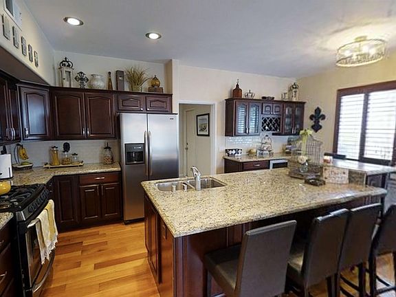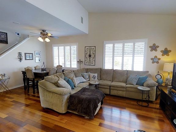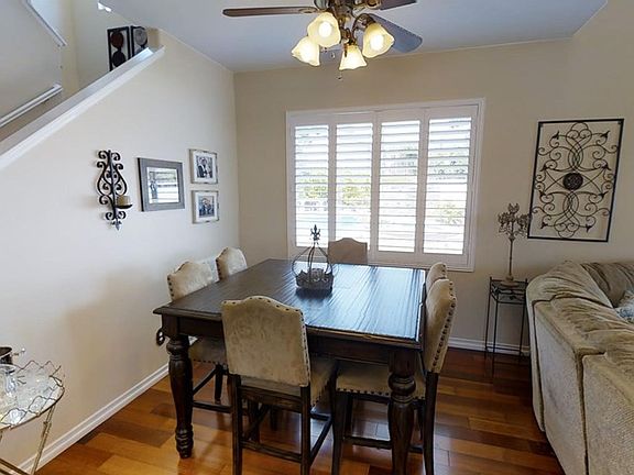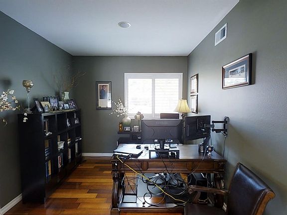 Stunning home offers Brazillian Cherry hardwood flooring, plantation shutters throughout, downstairs den/office, stunning pool in large backyard, beautifully remodeled kitchen with dark cabinetry, granite counter tops on center island, built-in wine niche with it's own wine fridge, fireplace in family room, newer carpet, large master bedroom and bath, and window overlooking crystal clear pool. Two additional bedrooms upstairs, and plenty of storage space. Solar power. Cul-de-sac location, no HOA fees.